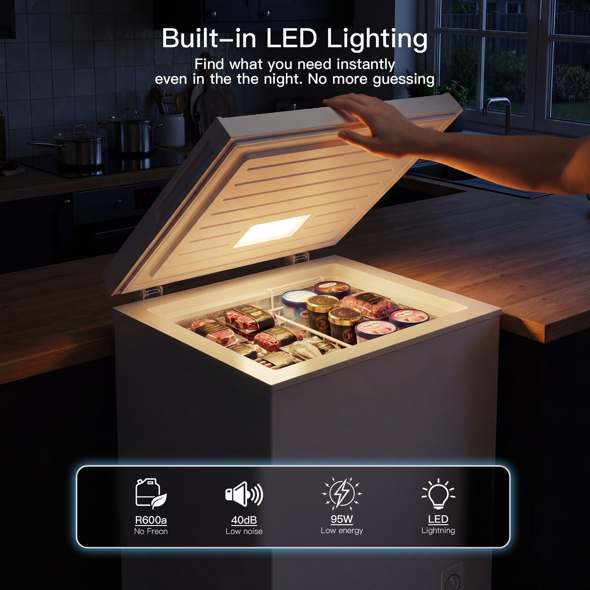 - Convenient Storage & Built-in LED Light:The two detachable storage baskets of this freezer chest keep your items organized,letting you access small items without bending over or rummaging through the entire freezer.The built-in LED light illuminates the interior clearly,so you can quickly find what you need even in dark environments.This humanized design greatly enhances the usability of this small chest freezers for daily use.